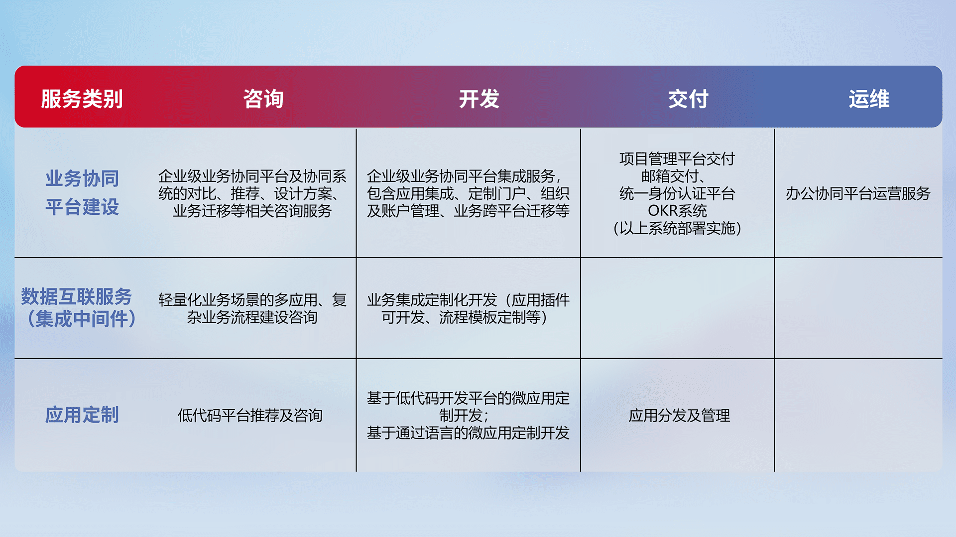 针对钉钉、、、企微、、、、IDaas等平台级产品提供产品的规划、、、方案、、、交付、、、、定制化开发等服务,,,,实现如统一协同办公、、智能客户服务、、、混合会议管理、、、智能数据查询、、、、等业务场景,,,,实现数字化转型。。。
