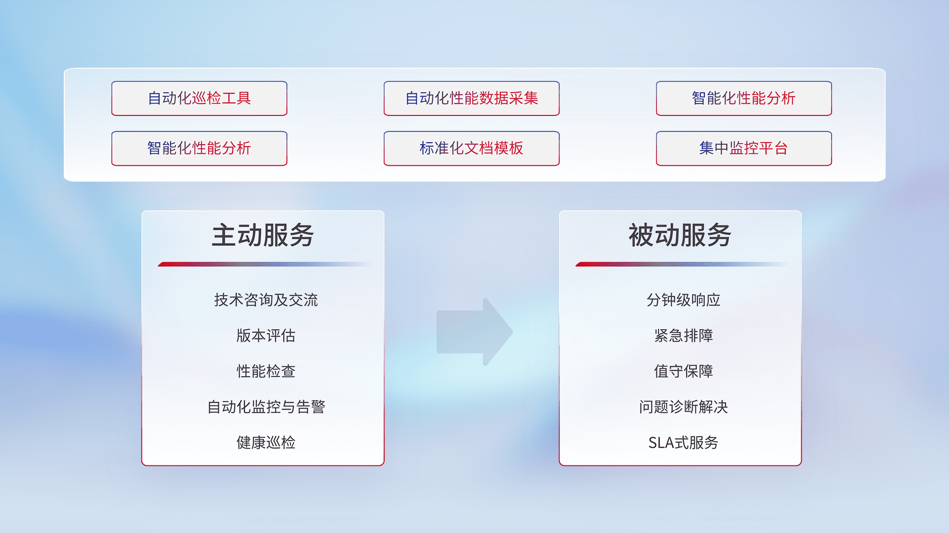 智能化工具和标准化文档,,,保障服务质量,,,,提供主动服务(包含技术咨询、、、、版本评估、、、性能检查、、、自动化监控与告警、、、、健康巡检)和被动服务包含(分钟级响应、、、紧急排障、、值守保障、、、、问题诊断解决、、、SLA服务)。。