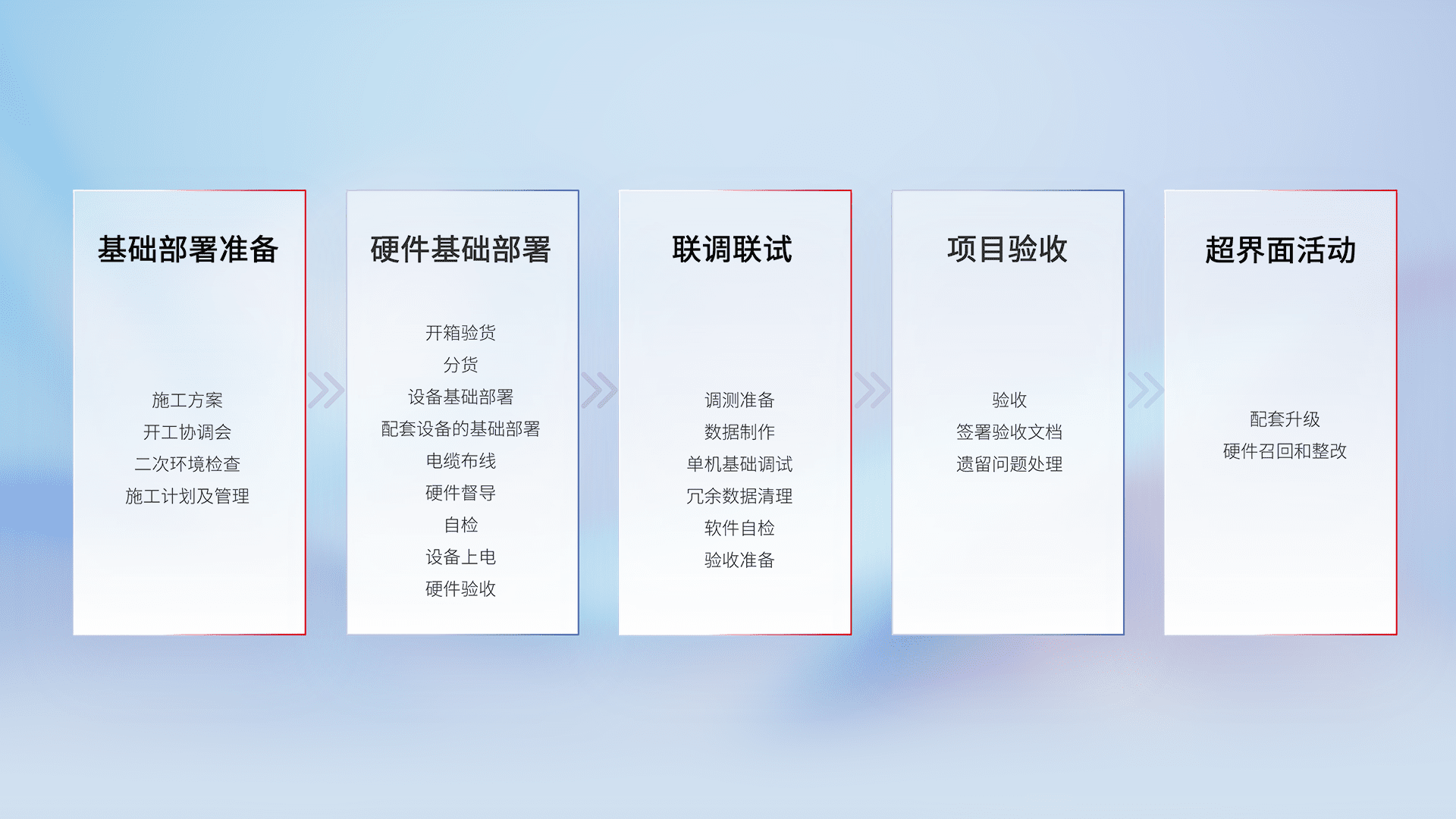 从基础部署准备、、、、硬件基础部署、、、、联调联试、、、、项目验收、、、、越界面活动的全过程可追溯,,,保证施工质量和进度。。